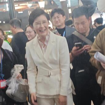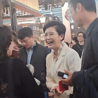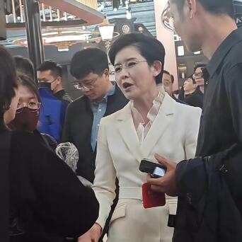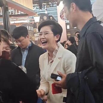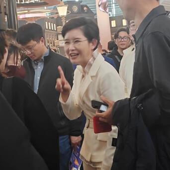 没想到王宁完全不一样,她在AWE现场人群中和周围的人聊天,动作表情相当夸张,一边说一边比划,甚至还伸出食指点来点去,同时张嘴哈哈大笑,笑得前仰后合,好像有什么特别开心的事情似的。
